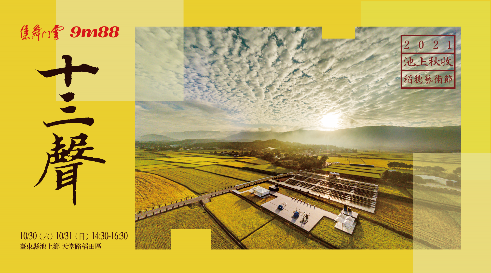《十三聲》是以艋舺街頭賣藝的傳奇人物十三聲為靈感所創作,描繪台灣街頭的故事與生命力。透過街頭人物的樣態身形、民俗歌謠的聲音傳遞、市井霓虹的色彩呈現,讓觀者當下串連過去、現在與未來。這次在池上的土地,回歸大自然的環境,以天地為幕稻穗為伴,雲門藝術總監暨《十三聲》編舞家鄭宗龍與知名製作人陳鎮川相互激盪,邀請流行樂手9m88共同演出,在舞蹈與吟唱的聲紋中,跨界激盪豐彩的生命能量。